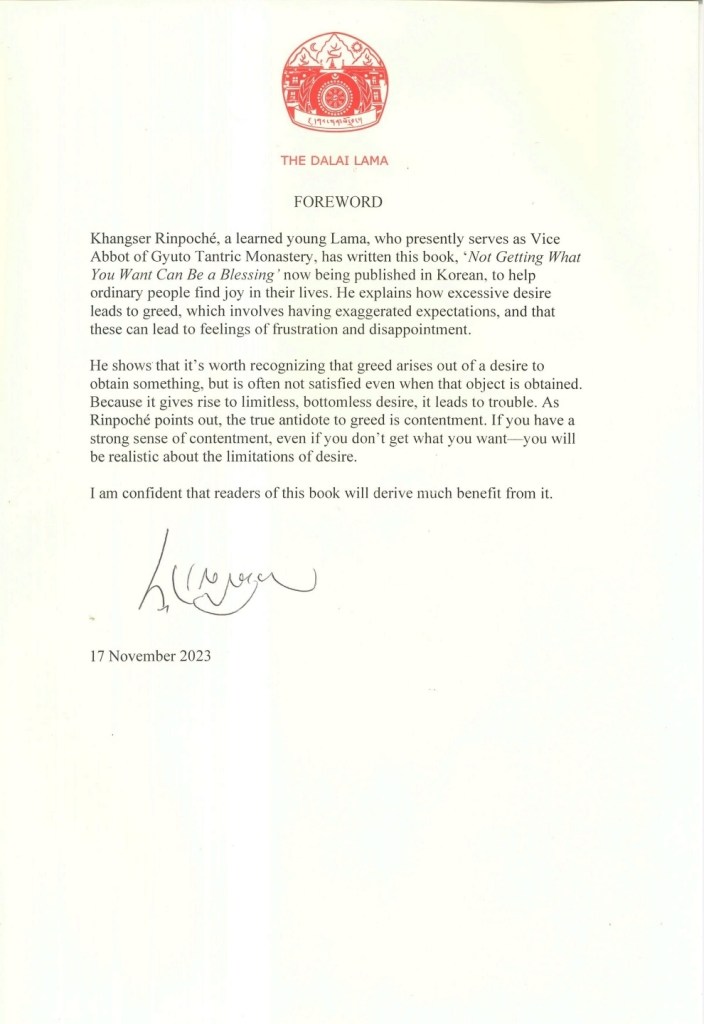 귣뙤 승원의 라마움제(부승원장)이자 뛰어난 젊은 라마인 캉쎄르 린뽀체가 이번에 한국에서 출간한 ⟪원하는 것을 얻지 못하는 것이야말로 축복⟫은 평범한 이들이 삶에서 기쁨을 찾는 것을 돕고자 집필한 책입니다. 그는 이 책에서 과도한 욕망이 어떻게 허황된 기대가 섞인 탐욕으로 변하는지와 욕망과 탐욕이 좌절과 실망을 초래할 수 있다는 점을 설명하고 있습니다.